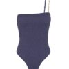 The ViX Bell One Piece is defined by a sleek one-shoulder design, accented with the gold-plated Bell detail, a straight neckline, and an open back.