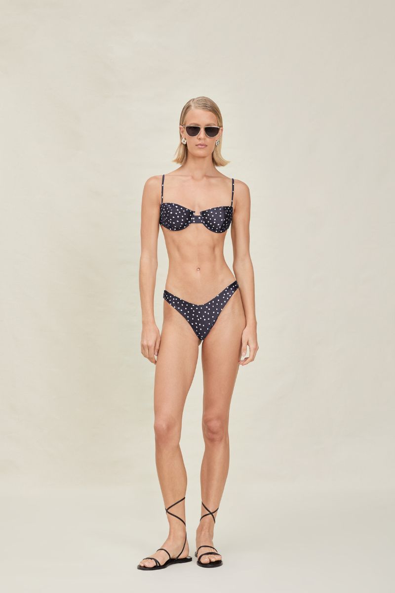 The Lady Top is an underwire top with adjustable straps and back closure. The Lady Bottom is a low-rise bottom with cheeky coverage.