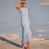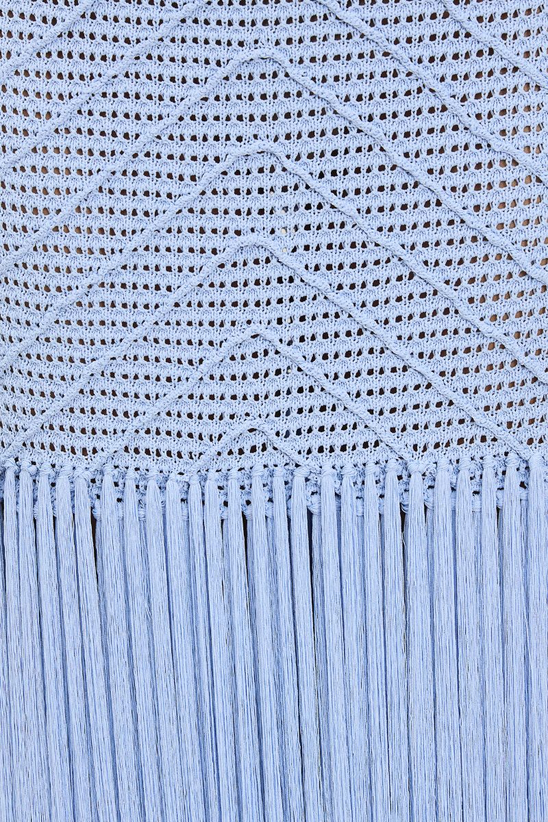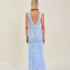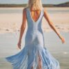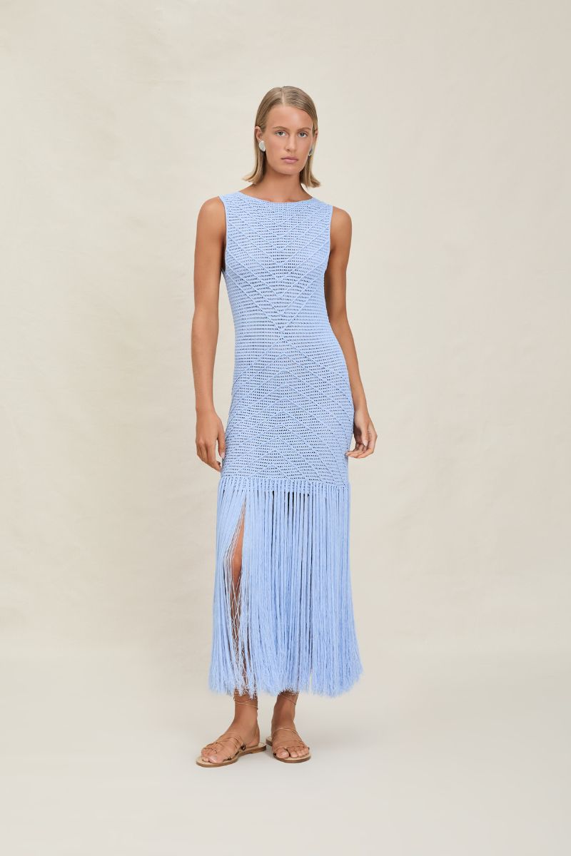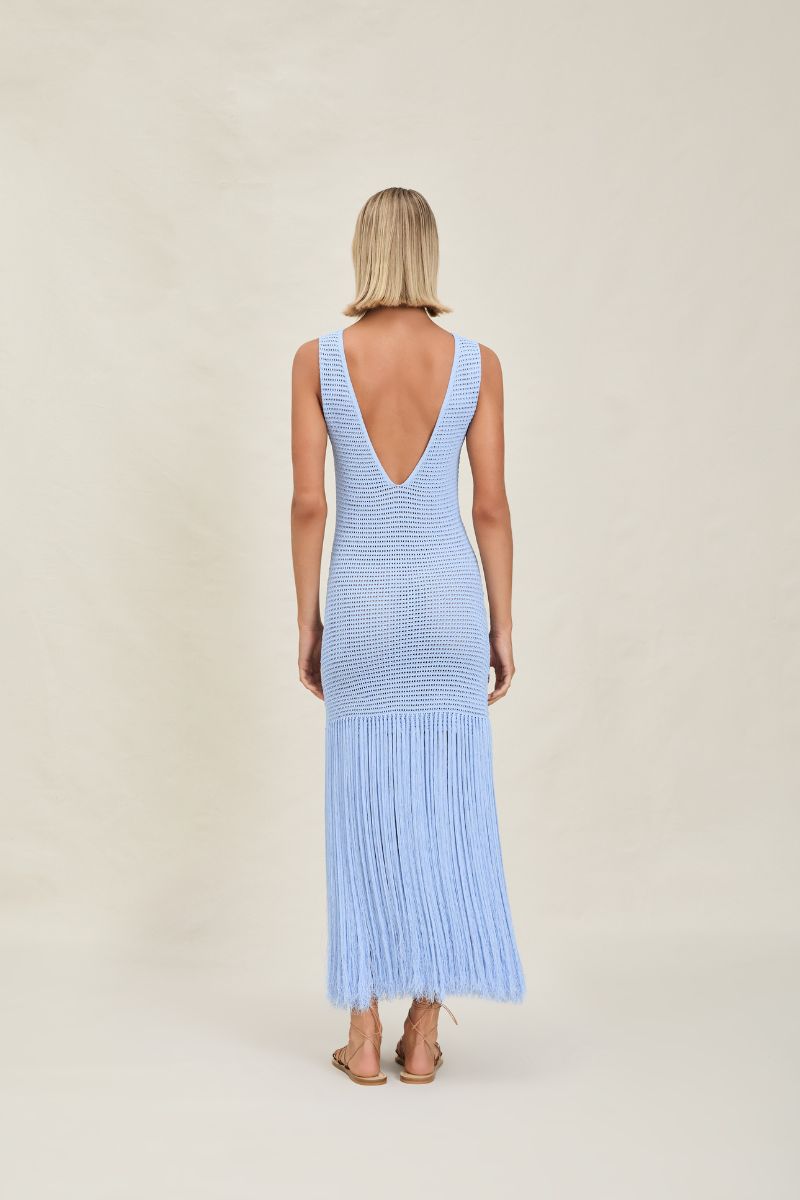 The Leiza is a maxi dress with a V-cut open back and two layers of fringe at the hem.