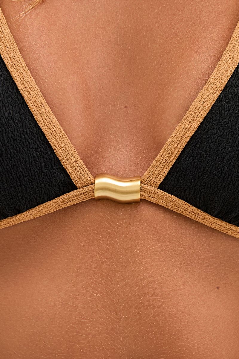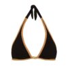 The ViX Lily Top is a halter style swim top with a V-neckline, a gold-plated detail at the bust, contrast piping throughout and tie closures at back.