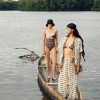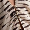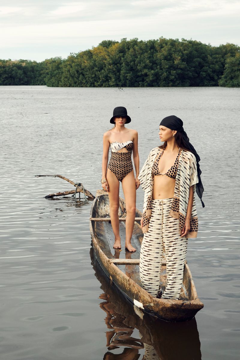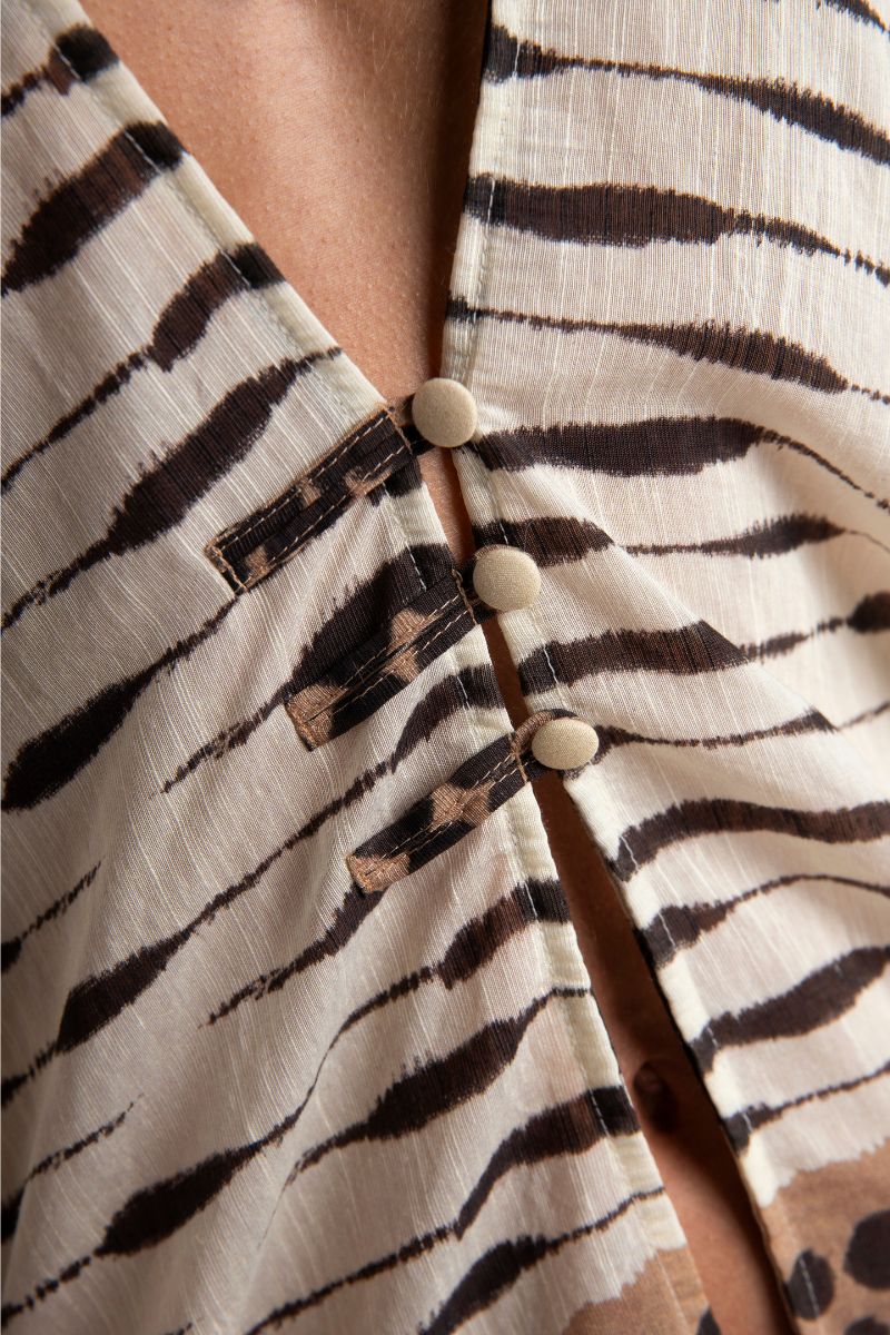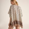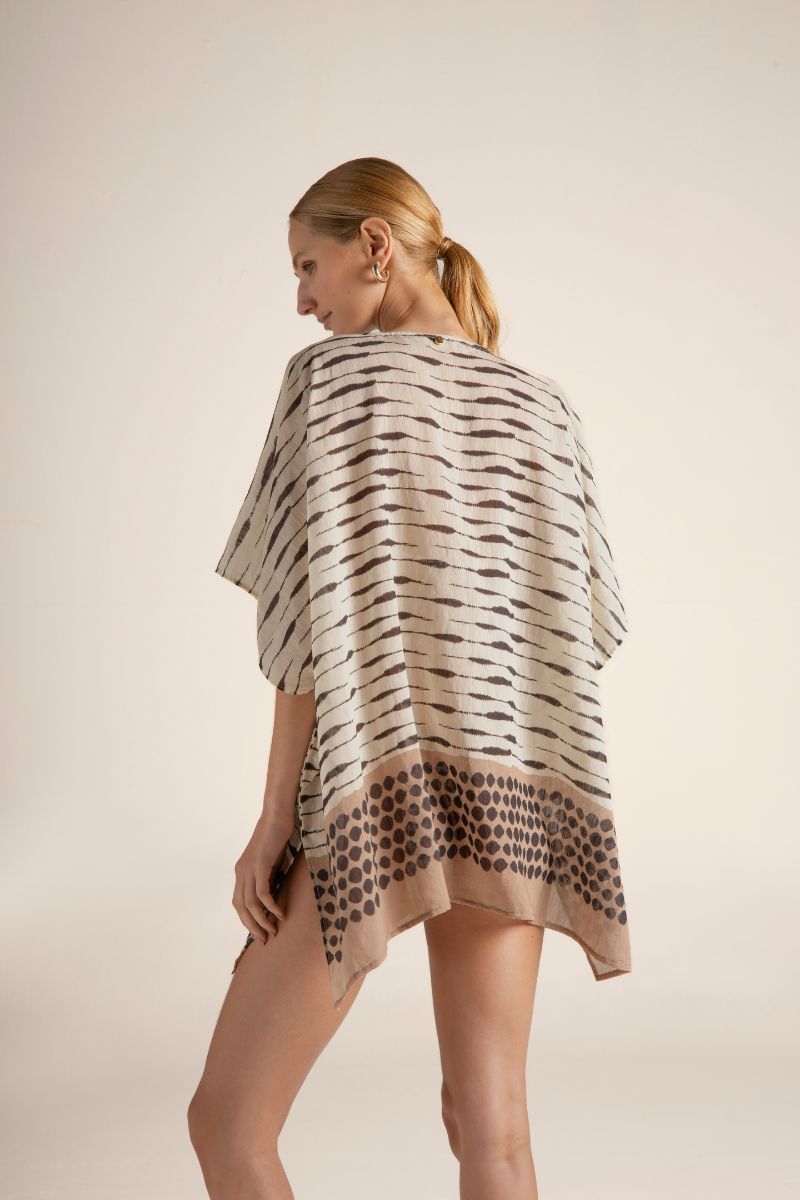 Short cover-up in polka dot and striped printed fabric; open at the front with loops and covered buttons for closure; poncho-style silhouette with closed sides; and a gold-plated coin engraved with the ‘t’ as a distinctive brand detail.