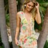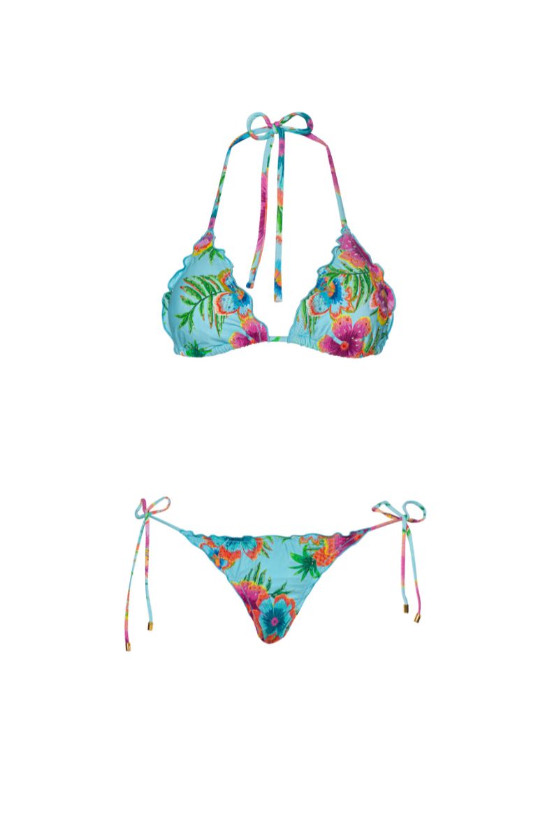 The Solana Top features a bright blue base with a flirty tropical floral print and delicate hand-embroidered beading. Finished with playful ripple lettuce-edge trim and adjustable ties, it offers a customized, feminine fit—designed to make a statement on your next getaway.