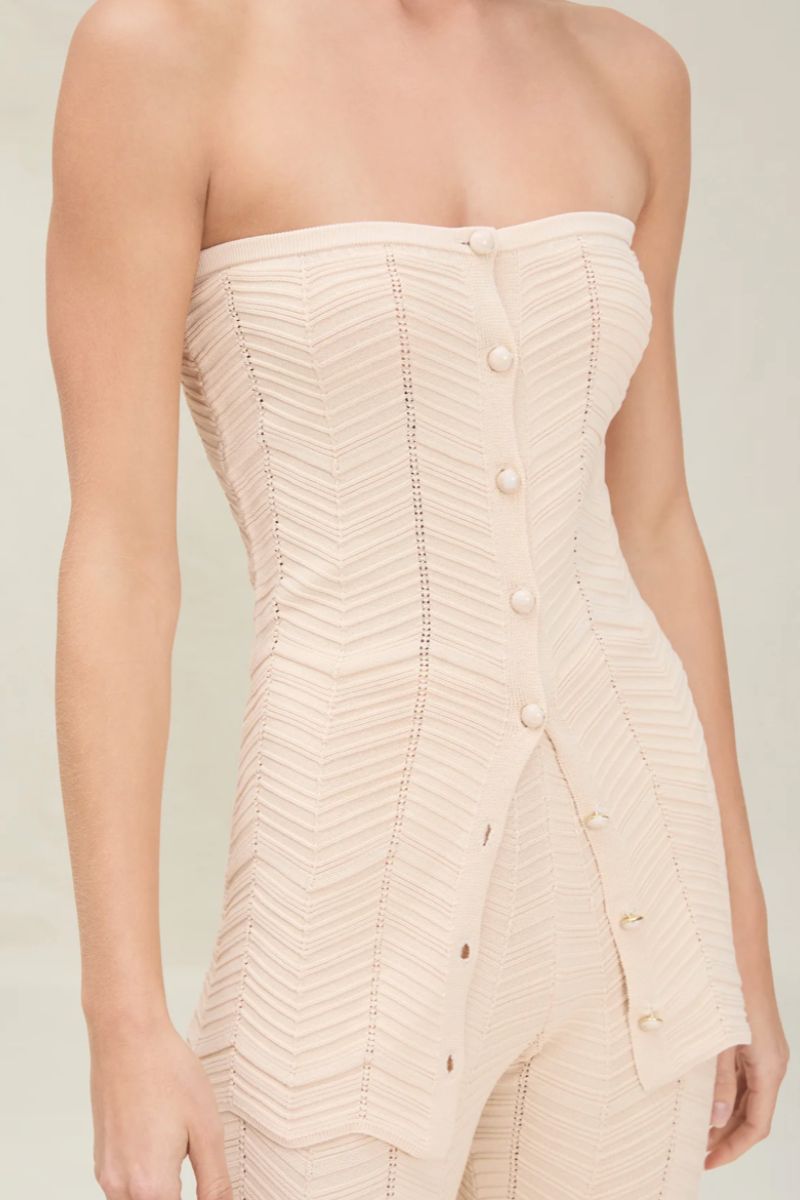 The Tiffany Top  is a strapless, button-down, knitted top.